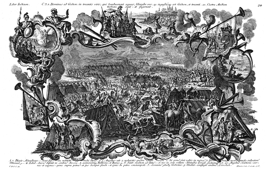 Description: This image depicts Gideon defeating the Midianites. At the top Gideon chooses his troops based on how they drink water. In the upper-left corner an angel of the Lord appears to the Israelites at Bochim, as the judge Shamgar reclines. At the bottom the Israelites mutilate Adoni-bezek. In the bottom-right corner Jael kills the general Sisera with a tent-peg and hammer, as instruments represent the song of Deborah and Barak. To the right Gideon receives a sign from God, while to the left an angel causes Gideon’s sacrifice to be consumed by fire. To the lower-left corner Gideon and Purah infiltrate the Midianite camp. In the upper-right corner Abimelech is struck by a millstone thrown from Thebez by a woman.