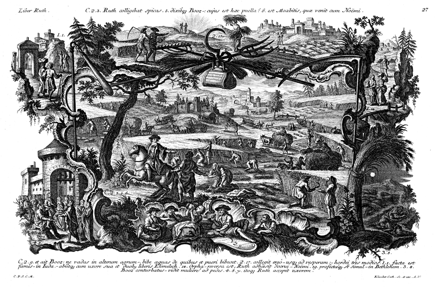 Description: This image depicts Boaz coming to his fields from Bethlehem, to find Ruth gleaning among the sheaves behind the reapers. In the top-left corner Elimelech and his wife Naomi go with their two sons from Bethlehem in Judah to the country of Moab. In the top-right Orpah departs, while Ruth stays with her mother-in-law Naomi. At the bottom Ruth drinks from the vessels drawn by the young men. At the top Ruth gleans in the fields of Boaz. In the bottom-right corner Ruth lies next to Boaz. In the bottom-left corner is Boaz, receiving the right to make Ruth his wife.