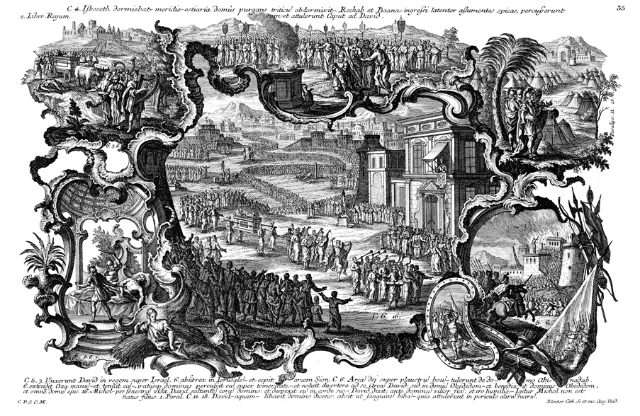 Description: This image depicts the Ark of the Covenant being brought to Jerusalem by a large procession of rejoicing Israelites, many of whom are playing musical instruments. King David is at the front, dancing and playing his harp. At the top the elders of Israel make David king over Israel at Hebron. In the bottom right-hand corner David leads the Israelites in capturing Jerusalem from the Jebusites. In the bottom-left corner Ishbaal is murdered in his bed by Rechab and his brother Baanah. In the top-left corner the Ark of the Covenant is brought from the house of Abinadab by a large procession of rejoicing Israelites, many of whom are playing musical instruments. King David is at the front playing his harp, when Uzzah reaches out to steady the ark and is struck dead.