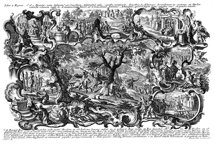 Description: This image depicts Absalom hanging by his hair from the branches of an oak tree, Joab and his men come upon him and kill him. In the top-left Ahithophel comes before Absalom and offers to assassinate King David, while Jonathan and Ahimaaz are hidden in a woman’s well, and David crosses the Jordan River with his men. In the top-right corner a messenger brings David news of the victory over Absalom, while to the right Joab greets David after the battle. At the top Mephibosheth greets David as he returns to Jerusalem. In the bottom-right corner Joab slays Amasa with his sword, while Sheba's head is thrown from the tower of the city of Abel of Beth-maacah. In the bottom-left corner seven of Saul’s descendants are impaled at Gibeon to avenge Saul’s abuse of the Gibeonites. To the right David orders Joab to take a census of the Israelites, while David builds an altar to the Lord to sacrifice burnt-offerings.