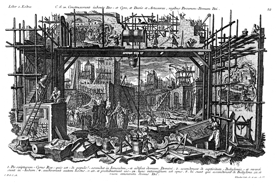 Description: This image depicts the rebuilding of the Temple in Jerusalem under the supervision of Joshua the High Priest and the governor Zerubbabel. To the right riches are brought to Jerusalem for the Temple in accordance with the decree of King Artexerxes I of Persia. At the top the Passover is celebrated under King Josiah of Judah after the finding of the law. In the bottom-right corner work takes place on the walls of the city.