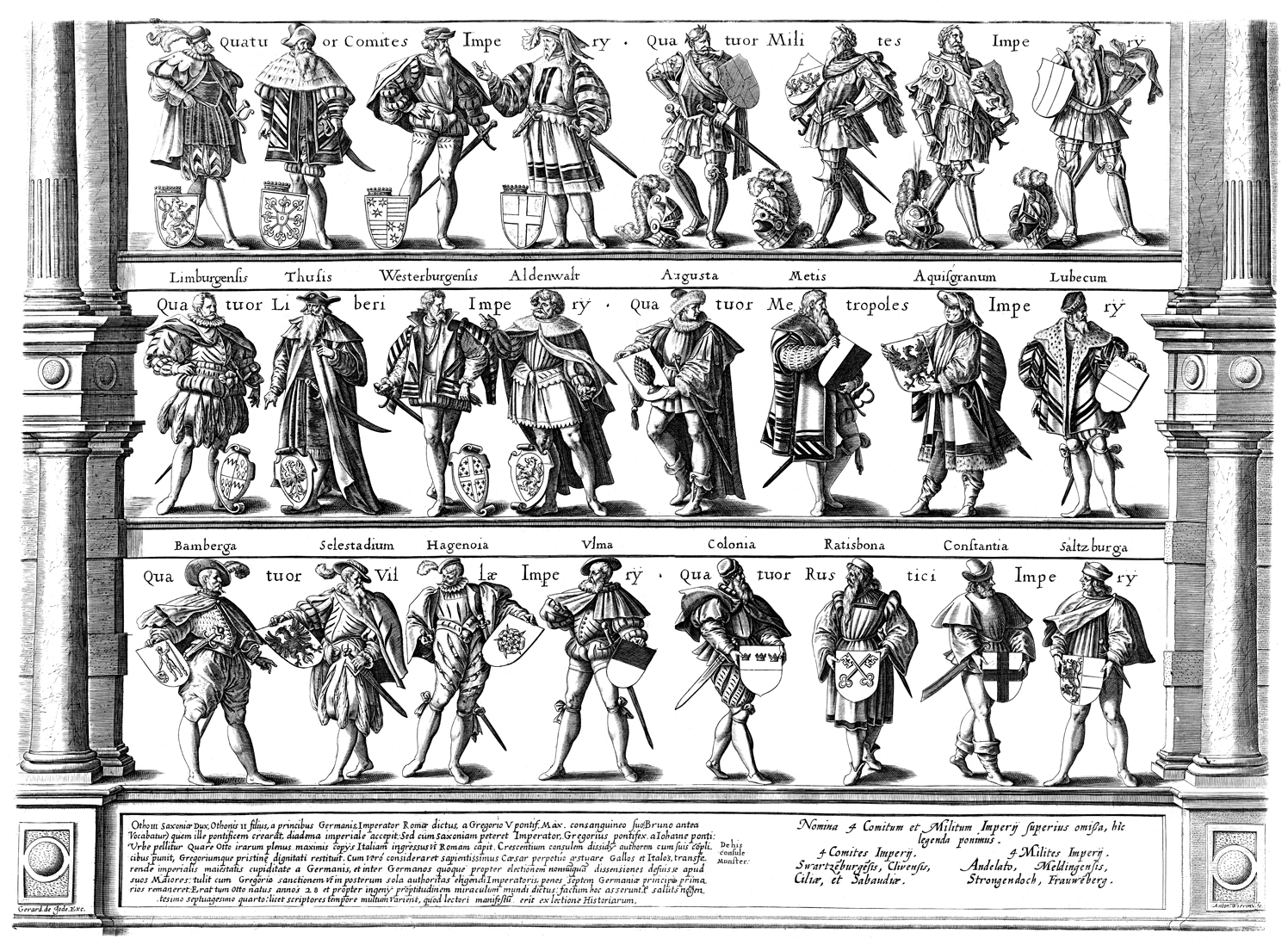 Description: The 24 electors of the Holy Roman Empire with their coats of arms, engraved by Gerard de Jode. On the second level is Metz and Aachen (or Aix-la-Chapelle). On the third level is Bamberg, Ulm, Cologne, Ratisbon (present-day Regensburg), Konstanz or Constance, and Salzburg.