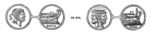 Description: An image of two Roman coins, one of which (right) contains an image of Janus, the Roman god of gates, doors, beginnings and endings.