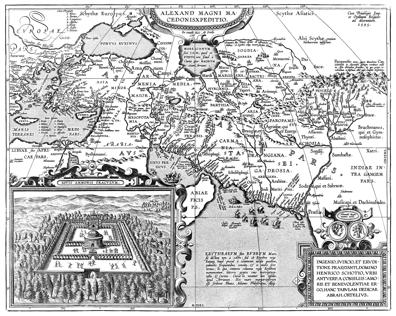 Description: A map of the expeditions of Alexander the Great of Macedon, including the areas of Arabia, Greece, Asia Minor, Persia, and India. At the lower left is the Oracle of Jupiter Ammon in the Libyan Desert.