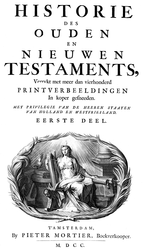 Description: A title page of a Dutch Bible with a depiction of a woman seated amidst a collection of scrolls and other objects. She holds two scrolls and a cross in her left hand and her right hand rests on another scroll. On a table to the left, there is a stack of books and a jar in the shape of the sacred heart of Christ. In the background there is an anchor .