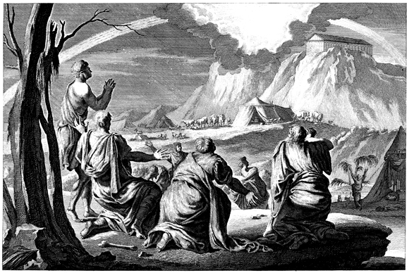 Description: This engraving, by Jan Goeree (1670-1731) and Latere, depicts a rainbow in the sky as a sign of God’s pledge to never again destroy the earth by flood, as Noah and his family gather in worship.