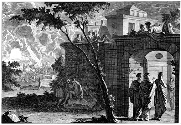 Description: Lot speaks with the two angels visiting Sodom and insists they stay the night with him. In the background, Sodom and Gomorrah are destroyed, and Lot’s wife turns into a pillar of salt after looking back toward the cities. The artist’s signature (Jan Goeree, 1670-1731) is located at the lower left corner, and the engraver’s signature (A. de Blois) at the lower right.