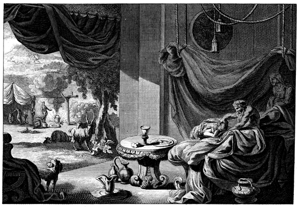 Description: Rebekah helps Jacob deceive his father, Isaac, into giving him Esau’s blessing, while Esau is away hunting game (background, upper left). The artist’s signature (Jan Goeree, 1670-1731) is located at the lower left corner, and the engraver’s signature (Jan Baptist, 1670-1731) at the lower right.
