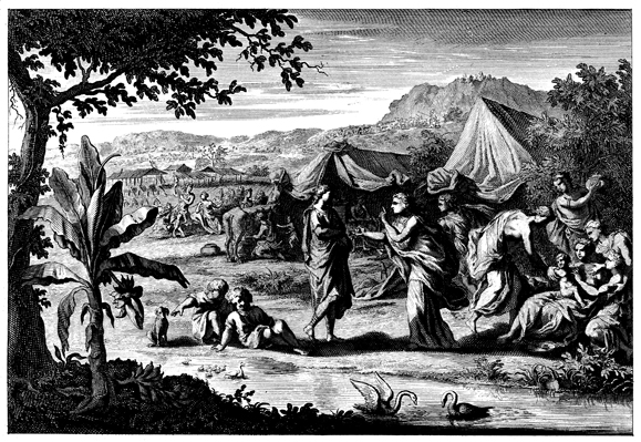 Description: This engraving, by Jan Goeree (1670-1731) and Joseph Mulder (1659/60-1718), depicts Leah giving Rachel the mandrakes in exchange for a night with Jacob.
