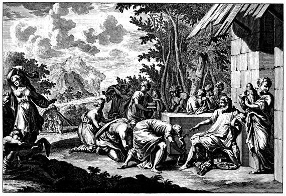 Description: Before building an altar to God at Bethel, Jacob instructs his family members and servants to bring all of their foreign gods before him. The artist’s signature (Jan Goeree, 1670-1731) is located at the lower left corner, and the engraver’s signature (Josepeh Mulder, 1659/60-1718) at the lower right.