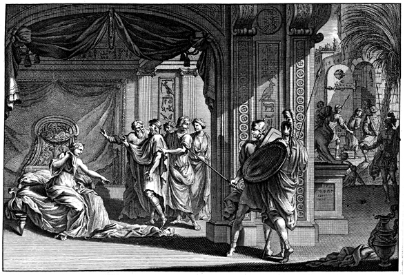 Description: This engraving, by Jan Goeree (1670-1731) and Jan Baptist (1670-1731), depicts Potiphar’s wife accusing Joseph of seducing her, as she points to the cloak he left behind after fleeing her seductive advances. In the background, Joseph is arrested by Potiphar.
