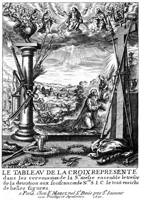 Description: This title-page image contains numerous symbols of Jesus passion. In the foreground are the elements of the Eucharist, bread and wine, along with a hammer and nails, dice, a crown of thorns, and a garment. A rooster crows on a pillar to the left. Attached to the pillar is a torch, a whip, and a sword with an ear attached, presumably the ear of the servant of the high priest. To the right is the cross of Jesus, with a spear and a stick with a sponge attached, presumably the sponge used to give Jesus something to drink while on the cross. In the center of the image is Jesus praying on the Mount of Olives, as an angel comes to minister to him bearing the cup of suffering. In the background the disciples sleep as a crowd led by Judas leaves the city gates of Jerusalem to arrest Jesus.