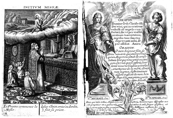 Description: To the left is an image of a priest saying Mass at an altar, while at the top Jesus prays in the Garden of Gethsemane. To the right is a text is flanked by an image of the arch-angel Michael to the left, standing on a defeated Satan, and the angel Raphael, with his attribute a fish, to the right. At the top Michael is shown in battle, a reference to his role as the commander of the Army of God, while Raphael is shown healing a man, a reference to his role as a healer.