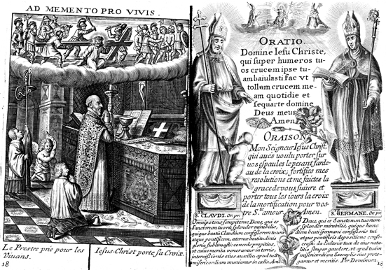Description: To the left is an image of a priest praying at the altar, while above Jesus carries his cross. To the right is a text flanked by an image of Saint Claudius of Besançon the Archbishop of Besançon (r. 685-687 CE) to the left, and Saint Germain the Bishop of Paris (r. 555-576 CE) to the right. At the top Jesus is shown with his cross.