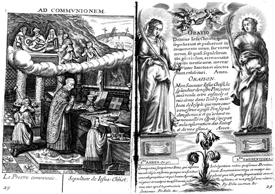 Description: To the left is an image of a priest taking communion at an altar, while above Jesus is buried in the tomb by Joseph of Arimathea and Nicodemus. To the right is a text flanked by an image of the virgin-martyr Saint Agnes to the left, with her attribute a lamb and a martyr’s palm, and Saint Emerentiana to the right, holding a martyr’s palm.