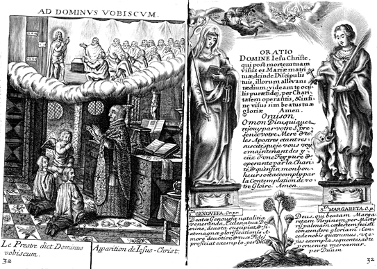 Description: To the left is an image of a priest saying the Dominus Vobiscum, or “the Lord be with you”, while above Jesus appears to his disciples. To the right is a text flanked by an image of Saint Genevieve to the left, with her attributes a lit candle and keys, and the virgin-martyr Saint Margaret to the right, holding a martyr’s palm and standing on her attribute, a slain dragon.