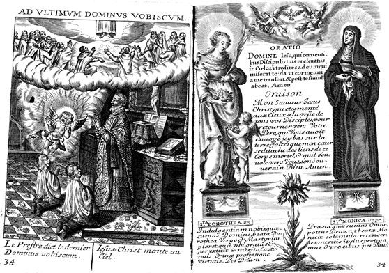 Description: To the left is an image of a priest saying the final Dominus Vobiscum, or “the Lord be with you”, of the Mass. Above Jesus is shown ascending into heaven. To the right is a text flanked by an image of the virgin-martyr Saint Dorothy, or Dorothea of Caesarea to the left, shown holding a martyr’s palm and her attribute a basket of fruit. To the right is Saint Monica, the mother of Saint Augustine of Hippo, clothed as a nun.