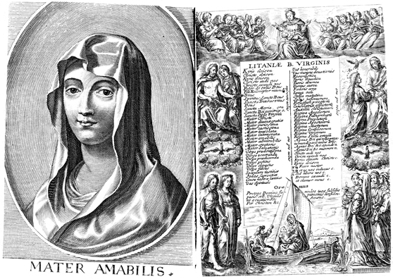 Description: To the left is an image of the Virgin Mary. To the right are scenes from Mary’s life, including a number of scenes with her and Jesus. At the top she is shown in heaven, surrounded by angels, with Jesus as a baby.