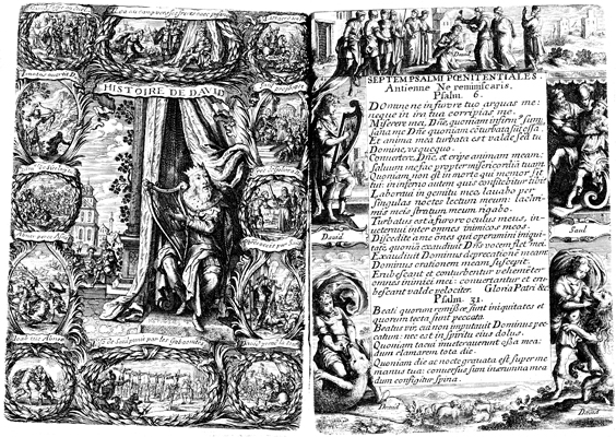 Description: To the left King David is shown with a harp, his attribute. He is surrounded by various scenes from his life. To the right, several scenes from the lives of King David and King Saul surround Psalm 6 and Psalm 31. At the top David is anointed by the prophet Samuel. To the left David fights a bear, and plays a harp. To the right is an image of King Saul and David fighting a lion.