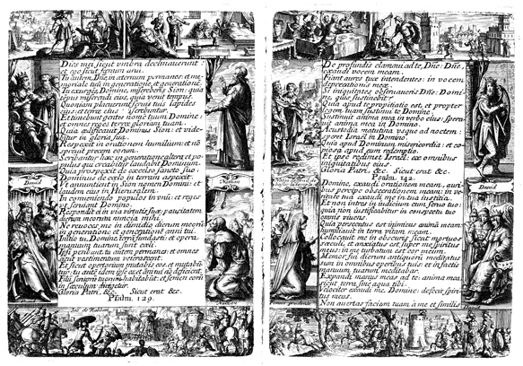 Description: To the left are various images of King David. At the top he is shown sending orders to have Uriah the Hittite placed at the front of the army in the battle. To the left David is shown on his throne, while to the right is shown the prophet Nathan. On the page to the right are more images surrounding Psalm 142. To the right King David plays the harp and sits on his throne, while at the bottom the general Joab kills David’s son, Absalom, as he hangs from a tree.