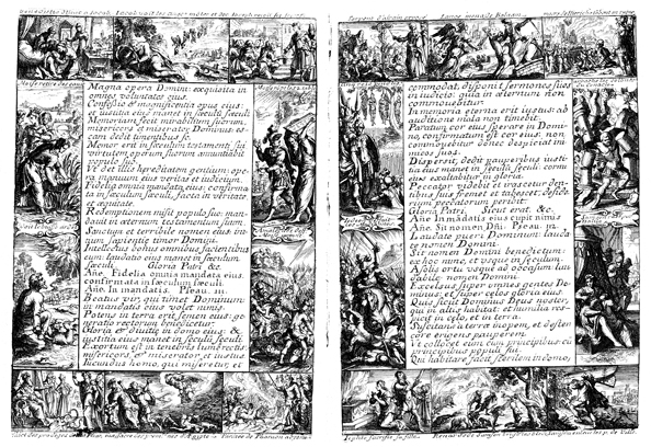 Description: To the left are various scenes from the Bible. Clockwise from the top left are the blessing of Jacob by Isaac, Jacob’s vision at Bethel, the visit to Egypt by Joseph’s brothers, Moses receiving of the Ten Commandments, Moses leading the Israelites to victory over the Amalekites, the drowning of Pharaoh’s army in the Red (Reed) Sea, the death of the first-born in Egypt, Moses rod becoming a serpent before Pharaoh, Moses at the burning bush, and Moses being found in the reeds as a baby. To the right are more scenes from the Bible. Clockwise from top left are the serpent raised in the wilderness by Moses, the angel seen by Balaam’s donkey, the siege of Jericho by the Israelites, Samson pulling down the columns in the temple of Dagon in Philistia, Delilah cutting Samson’s hair, Samson carrying doors, Samson tying torches to the tails of foxes, Jephthah sacrificing his daughter, Gideon battling the Midianites, and the hanging of the five kings.