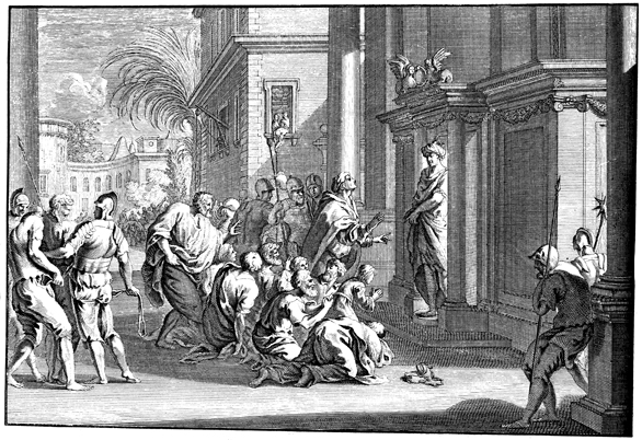 Description: This engraving, by Jan Goeree (1670-1731) and A. de Blois, depicts Joseph’s brothers kneeling before him and requesting grain (right), as he conceals his identity from his brothers, accuses them of being spies, and holds Simeon as a prisoner (left).