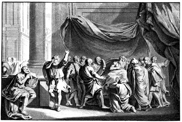 Description: Jacob blesses each of his sons before dying. The artist’s signature (Jan Goeree, 1670-1731) is located at the lower left corner.