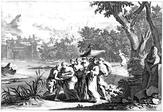 Description: As Moses’ sister watches (background), Pharaoh’s daughter and her maidservants discover Moses hidden in a basket on the bank of the Nile River. The artist’s signature (Jan Goeree, 1670-1731) is located at the lower left corner, and the engraver’s signature (Josepeh Muler, 1659/60-1718) at the lower right.