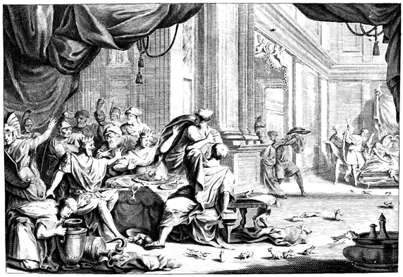 Description: Pharaoh’s feast is interrupted, as God causes frogs to overtake Pharaoh’s house and the entire land of Egypt.