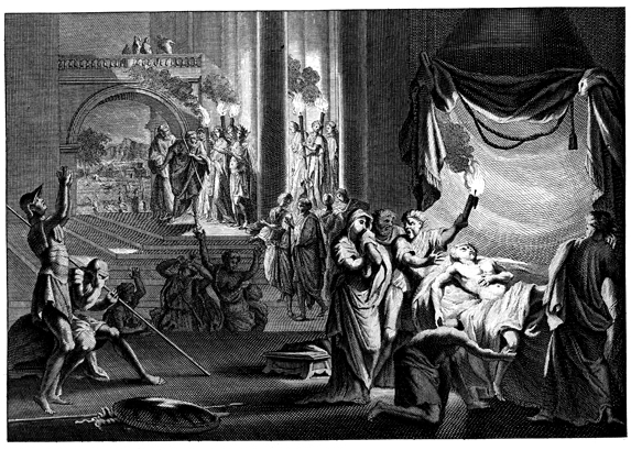 Description: Moses and Aaron announce to Pharaoh the tenth and final plague, the death of Egypt’s first born sons (background), as an Egyptian family mourns the loss of their son. The artist’s initials (Jan Goeree, 1670-1731) are located at the lower left corner, and the engraver’s initials (Jan Baptist, 1670-1731) at the lower right.