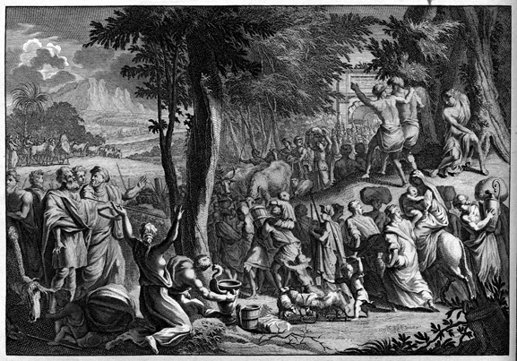 Description: This engraving, by Jan Goeree (1670-1731) and Jan Baptist (1670-1731), depicts Moses and Aaron assembling the Israelites to leave Egypt, after receiving gifts of gold and silver from the Egyptians.