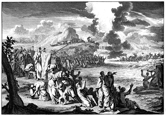 Description: As Moses and Israel stand safely on the shore, Pharaoh's army is drowned in the Red (Reed) Sea. The artist’s signature (Jan Goeree, 1670-1731) is located at the lower left corner, and the engraver’s initials (Jan Baptist, 1670-1731) at the lower right.