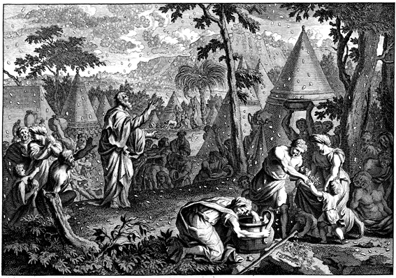 Description: The Israelites gather manna as it falls from heaven. The artist’s signature (J. Le Potre) is located on a rock at the lower right corner, and the engraver’s (Jan Baptist) at the lower left.