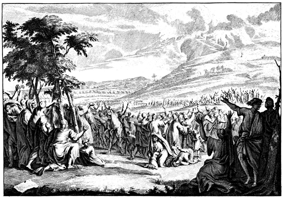 Description: This engraving, by Jan Goeree (1670-1731) and H. Elant, depicts God descending upon Mount Sinai and speaking with Moses, as the Israelites gather around the mountain in great awe.