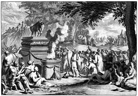 Description: This engraving, by Jan Goeree (1670-1731) and Jan Baptist (1670-1731), depicts the Israelites dancing, singing and playing instruments around a golden calf, while Moses speaks angrily with Aaron. In the background (upper left), Moses receives the Ten Commandments from God.