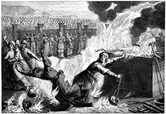 Description: Nadab and Abihu are consumed by fire for offering an improper sacrifice. In the background, Moses (indentified by two beams of light) instructs Aaron not to mourn for his sons. The artist’s signature (Philip Tideman, 1657-1705) is located at the lower left corner, and the engraver’s signature (A. de Blois) at the lower right.