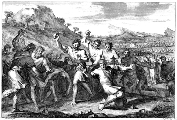 Description: An Israelite man is stoned for working on the Sabbath, while Moses (indentified by two beams of light) stands nearby (background). The engraver’s signature (J. de Laeter) is located at the bottom left corner, and the artist’s (Ellenger) at the lower right.