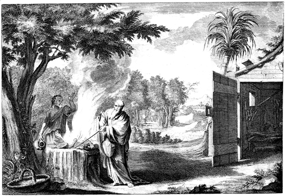 Description: Fire from God consumes Gideon’s sacrifice beneath an oak tree, after an angel touches it with his staff. The artist’s signature (Jan Goeree, 1670-1731) is located at the lower left corner, and the engraver’s (Jacobus de Latere) at the lower right.