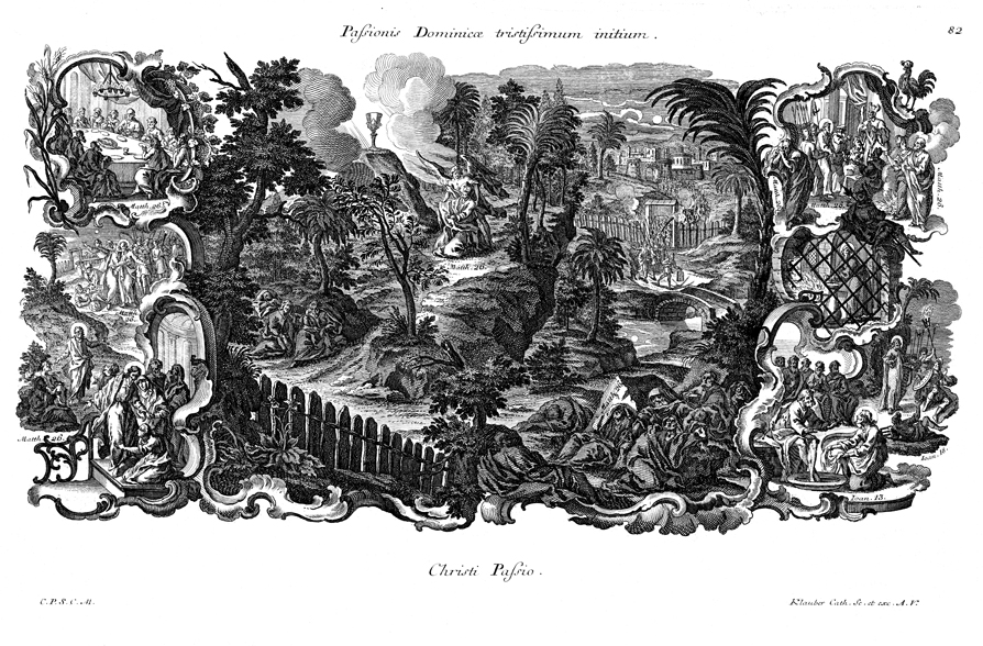 Description: This image depicts the Passion of Christ. In the center Jesus prays in the Garden of Gethsemane and an angel ministers to him, as Peter, James and John sleep. Judas can be seen in the background leading the soldiers and Temple police to arrest Jesus. In the top-left corner, Jesus celebrates Passover, or the Lord’s Supper, with his disciples. To the left Judas betrays Jesus with a kiss, as Peter strikes Malchus, the servant of the high priest with a sword, cutting off his ear. In the bottom-left corner Jesus is anointed by a sinful woman, and Jesus asks Peter, James, and John to wait with him as he prays in the Garden of Gethsemane. In the top-right corner Jesus is brought to the house of Caiaphas the high priest after his arrest. In the bottom-right corner Jesus washes the feet of his disciples, and the soldiers who come to arrest Jesus fall down before him after he uses the divine name I AM.