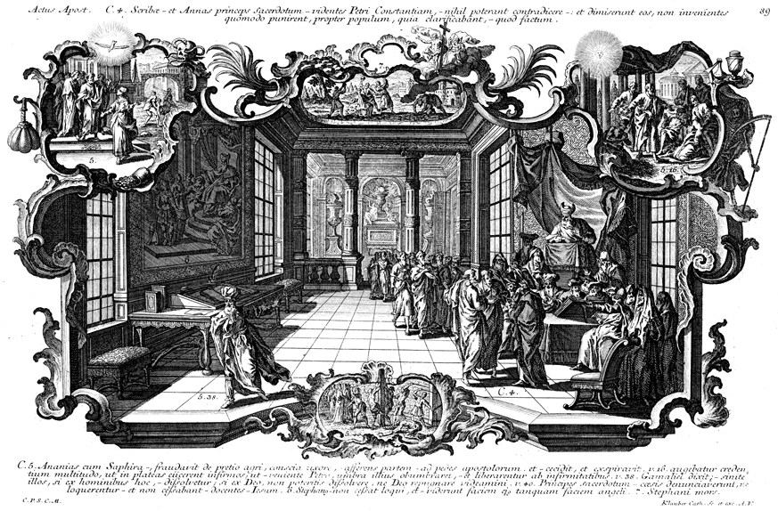 Description: This image depicts Peter defending the healing of the paralytic by preaching the gospel of Jesus Christ. To the bottom-right the Pharisee Gamaliel suggests leaving Jesus’ disciples alone. On the wall to the left Stephen is brought before the council. In the top-left corner Peter confronts Sapphira about selling the field, as the body of her husband Ananias is taken out. At the top in the middle Stephen is stoned to death. In the top-right corner people bring those needing healing out so that they may fall in Peter’s shadow as he passes by and be healed. At the bottom the apostles are flogged for teaching the gospel.