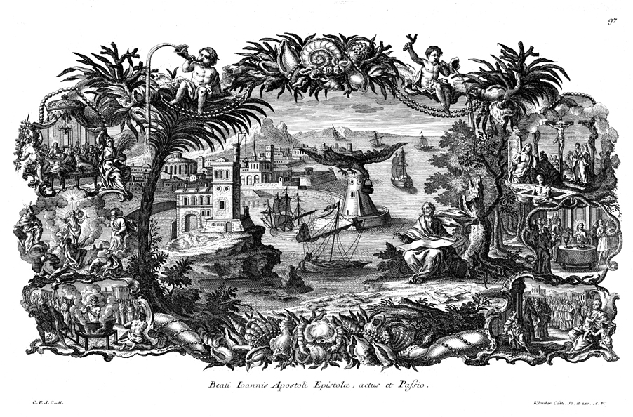 Description: This image depicts the Apostle John writing the three Johannine epistles with his attribute, an eagle, flying towards him. The image is surrounded by episodes from the life of Christ, including the crucifixion. In the bottom-left corner John is placed in a burning cauldron of oil, but suffers no injuries.