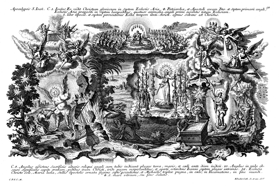 Description: This image depicts John falling at the feet of the Lord, described as "like a son of man" with a face like the sun, a two-edged sword coming from his mouth, a flowing robe, seven stars in his right hand, and standing amid seven lampstands. At the top is John's vision of the heavenly throne room. In the top-left corner an angel stands at the altar with a censer of burning incense, whose smoke rises up with the prayers of the saints to God, as seven angels with seven trumpets prepare to announce the coming of calamitous happenings. To the bottom-left an angel wrapped in a cloud, with a rainbow over his head, a face like the sun, and legs like pillars of fire instructs John to eat the little scroll. To the bottom-right the woman's baby is saved from the beast upon his birth and the dragon is defeated by the angel Michael.