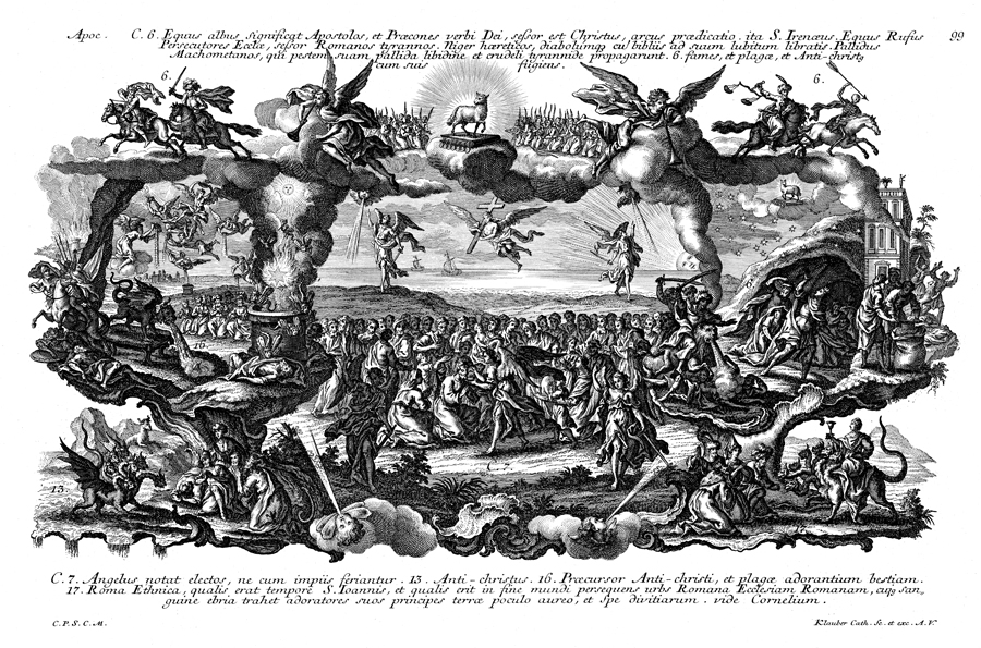 Description: This image depicts angels holding the winds of the four corners of the earth back, while the 144,000 saints are sealed with the mark of Christ. In the top-left and top-right corners are the four horsemen of the Apocalypse. To the right upon the opening of the sixth seal, there is a great earthquake, the sun turns black, the moon turns to blood, and the stars fall from the heavens. In the bottom-left corner the beasts of the land and sea are worshiped. To the left angels pour out the seven bowls of wrath upon the earth. At the bottom of the image, a dragon breathes out unclean spirits in the form of frogs. In the bottom-right corner the whore of Babylon rides the beast with seven heads and ten horns.