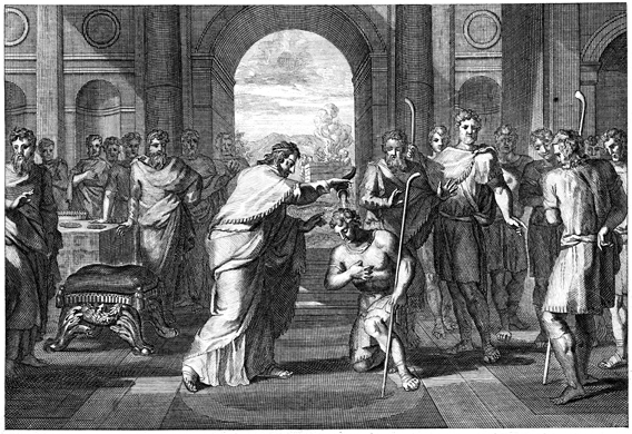 Description: This engraving, by Otto Elliger, depicts Samuel anointing the young David as Israel’s next king, as David’s family stands nearby. In the background, Samuel, Jesse and David sacrifice a heifer upon an altar.