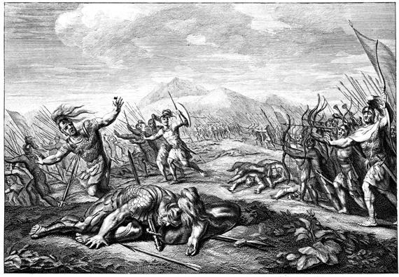 Description: This engraving, by Otto Elliger, depicts Israel’s army retreating from the Philistines. Saul’s armor bearer falls on his sword when he discovers that Saul has done the same.