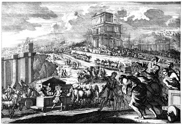 Description: This engraving depicts the construction of the Temple during the reign of King Solomon. Teams of laborers are shown moving the stones from the quarry to the construction site.
