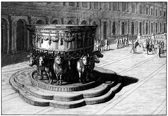 Description: This engraving by Otto Elliger depicts the bronze sea made by Solomon for the temple, including the twelve cast oxen supporting the sea, with three each facing north, south, east, and west. In the background a man is shown holding one of the golden lampstands.