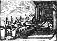 Description: Out of the sea emerge four beasts: one with the head of a lion and wings of the eagle; a second was in the form of a bear and had three ribs in its mouth; the third beast had four heads and four wings; and the fourth beast had long teeth, multiple horns, and hooves like those of an ox. Daniel sleeps on the right.