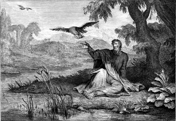 Description: This engraving by Otto Elliger shows Elijah being fed by ravens during the drought.