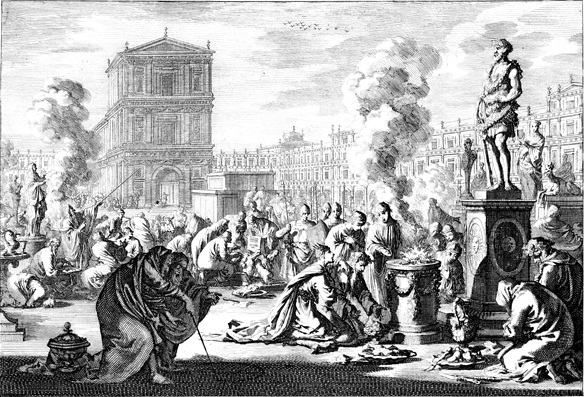 Description: This engraving by Otto Elliger depicts the idolatry of the reign of King Manasseh of Judah. Sacrifices and offerings are being made at the altars of foreign gods surrounding the Temple.
